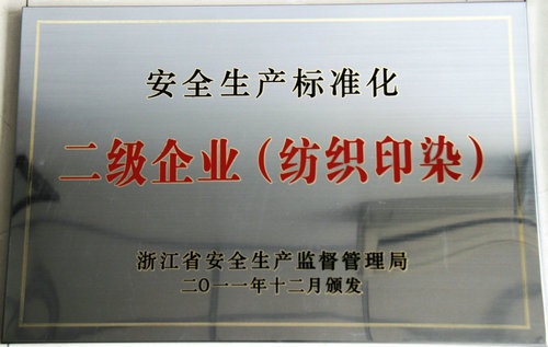 2011年12月,浙江人生就是博染整有限公司被浙江省宁静生产监督治理局命名为宁静生产标准化二级企业